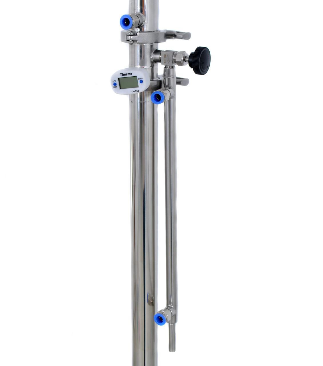 Універсальна бражная колона 2 в 12" Магнум Профі-3 /Спецсерія/Вузол відбору МагПро з доохолоджувачем в комплекті! Без куба - 6450 грн. Переваги:1. Два способи відбору (по пару і рідини) в одному апараті2. Простота налаштування відбору "голів" через вузол відбору рідини з3. Стабільність роботи апарату - не залежить від стрибків тиску води4. Суперпотужний Піт-Стілл (перший перегін) при мінімальному споживанні води5. Потужні ТУРБО конденсатори (9 трубок з перегородками) АКЦІЯ! Сантехкомплект (шланг поліуретановий, голчасті крани, трійники, быстросьемы) в подарунок! Додаткова АКЦІЯ! Комплект (5шт) насадок РПН з нержавійки в подарунок (тільки при покупці з перегінним кубом)! Принцип роботи:Перший перегін (Режим Pot-Still). Отримання спирту-сирцю (СС)Залийте вихідний продукт в перегінний куб, але не більше 80% від загального обсягу ємності для цукрової або не більше 65% для фруктової та зернової браги. Для ефективного використання води послідовно з'єднайте два конденсатора. В такому режимі можна працювати до 8 кВт потужності при мінімальному споживанні води. Підключіть подачу води в нижній штуцер охолоджувача №1. З верхнього штуцера з допомогою шланга направляємо воду в нижній штуцер охолоджувача №2. З верхнього штуцера другого охолоджувача виводимо воду в каналізаціюПерший перегін рекомендується закінчувати при фортеці СС в течії 15-20%, що відповідає показнику верхнього термометра 98 градусів ЦельсіяУвага! При з'єднанні двох конденсаторів внутрішні трубки повинні збігатися і просматриватся наскрізь!Другий перегін - Режим відбору за паруВикористовуйте СС розведений до фортеці 25-35 градусів у кількості не більше 85% загального обсягу ємностіПісля нагрівання спиртовмісні пари піднімаються вгору по колоні. Потрапивши в дефлегматор, вони конденсуються і у вигляді флегми (конденсату) потрапляють у вузол відбору по рідини. Частина флегми затримується у вузлі відбору, а надмірна її частина стікає вниз по царге, зрошуючи насадку. Пари, що піднімаються вгору, і флегма, що стікає вниз по насадці, вступають в процес спільного тепломасообміну. В результаті цього процесу більш важкі фракції парів конденсуються, більш легкі частини флегми переиспаряются і знову піднімаються вгору. Утворюється свого роду "паровозик" - вгорі накопичуються більш легкі фракції, внизу більш важкі. Відкривши кран вузла відбору збираємо більш легкі фракції - "голови". Зібравши їх, перекриваємо кран і додаємо потужність нагріву перегінного куба та/або зменшуємо подачу води на дефлегматор. Починаємо відбір "тіла продукту" через приймальний "носик" (вузол відбору за пару)Регулюючи подачу води в дефлегматор краном тонкої настройки ми змінюємо швидкість відбору продукту і температуру вгорі колони. Не рекомендується підняття температури в колоні больлее ніж 0.5-1 градус Цельсія. Утримуючи температуру на одному рівні, ми перешкоджаємо попаданню хвостових фракцій у кінцевий продуктЦей режим використовують при перегоні цукрових браг для отримання якісний продукту (недоректификата) міцністю до 95 градусівНаповнивши царгу мідної насадкою, можна переганяти фруктово-ягідні та зернові напої. Але більш ароматними вони будуть якщо використовувати режим відбору "тіла" рідиниДругий перегін - Режим відбору рідини зЗалийте СС в перегінний куб, попередньо розбавивши його до фортеці 30-40 градусів (цу