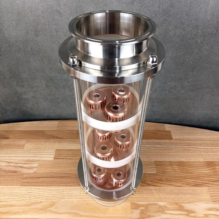 Колпачковая колона Вавилон під кламп 4" з ковпачками ProCap. Потужність до 8 кВт Ціна вказана за базову комплектацію з 3-х рівнів! 3 рівні рекомендується для напоїв "під бочку"4 рівні для вживання в "білому" вигляді5 рівнів або більше рекомендується для цукрових браг Професійні ковпачки ProCap мають по центру зливний отвір для флегми, що робить їх універсальними. Немає необхідності встановлювати зливний ковпачок. Одіна тарілка ProCap працює на дуже широкому діапазоні від 2000 до 8000 Вт. Принцип роботи колпачковых тарілок полягає в тому, що надходить робоча середовище заповнює тарілку до зливної перегородки. При цьому ковпачки повністю занурені в рідину. Пара надходить крізь щілини ковпачків і барботирует через шар робочої середовища Ідеально підходить для фруктово-ягідних і зернових напоїв. Мідь зберігає смак і запах вихідного продукту, а також прибирає сполуки сірки. Також підходить для роботи на цукрових бразі. Для максимального очищення цукрових дистилятів бажано встановлювати 4-5 рівнів (тарілок) або більше Власне виробництво Характеристики:Висота 3-х рівнів:Висота дод. рівня:Робоча потужність: 2500-8000 ВтМатеріал: мідь м1Фланець: харчова нержавіюча стальПрокладка: харчовий силіконДіаметр скла: 109-110 ммТовщина скла 5 мм Параметри з упаковкою (Д/Ш/В, вага):16/16/40см., 5,5кг