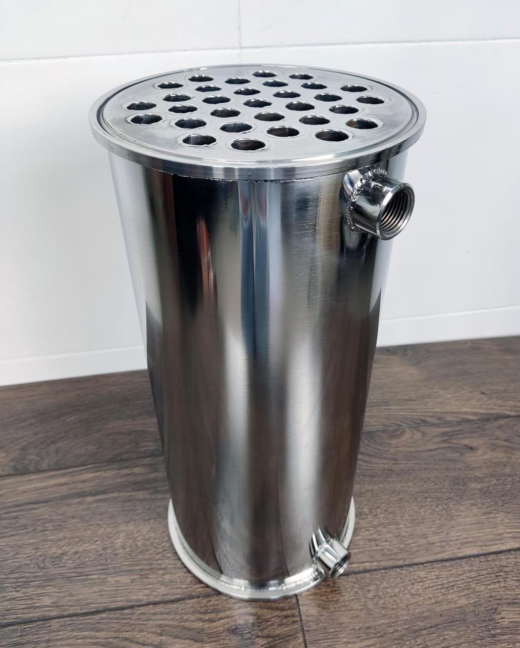 Характеристики товару: • Дефлегматор (конденсер) 6"• Загальна висота: 350мм;• Кількість трубок: 31 трубка по 14 мм• Наявність перегородок: 3 перегородки (для завихрення потоку охолоджувальної рідини);• Розрахункова робоча потужність: до 15 кВт (при роботі "на себе") • Підвід води: різьба внутрішня 1/2" (швидкоз'єми в комплект товару не входять!)• Матеріал: нержавіюча сталь AISI304