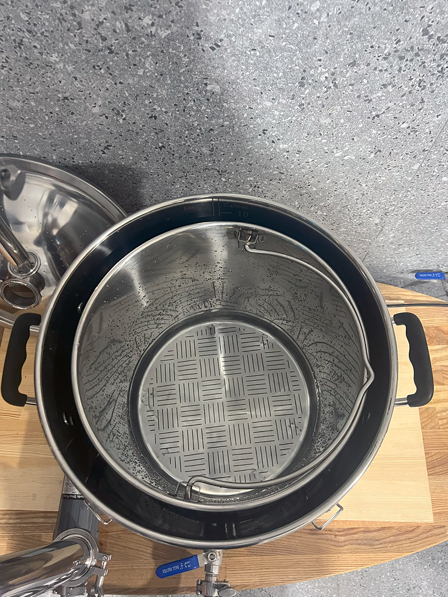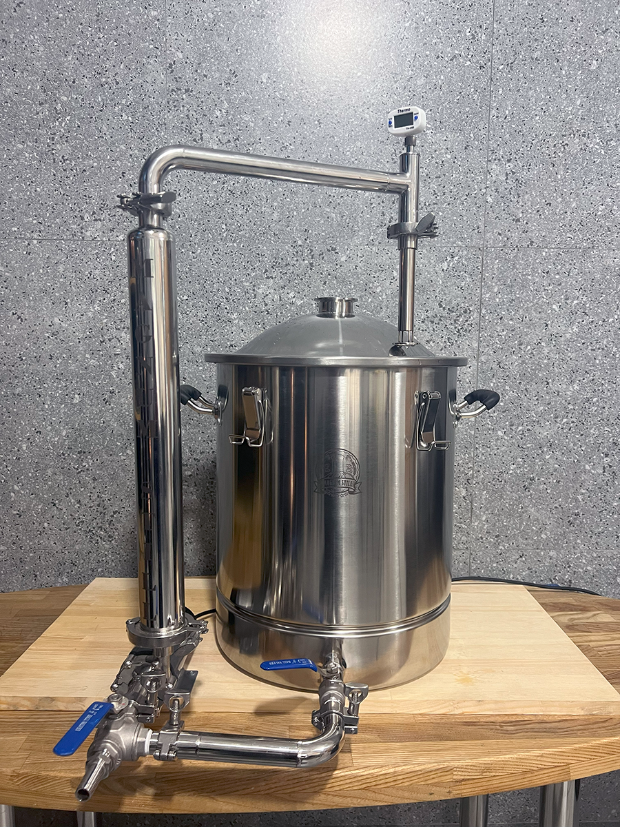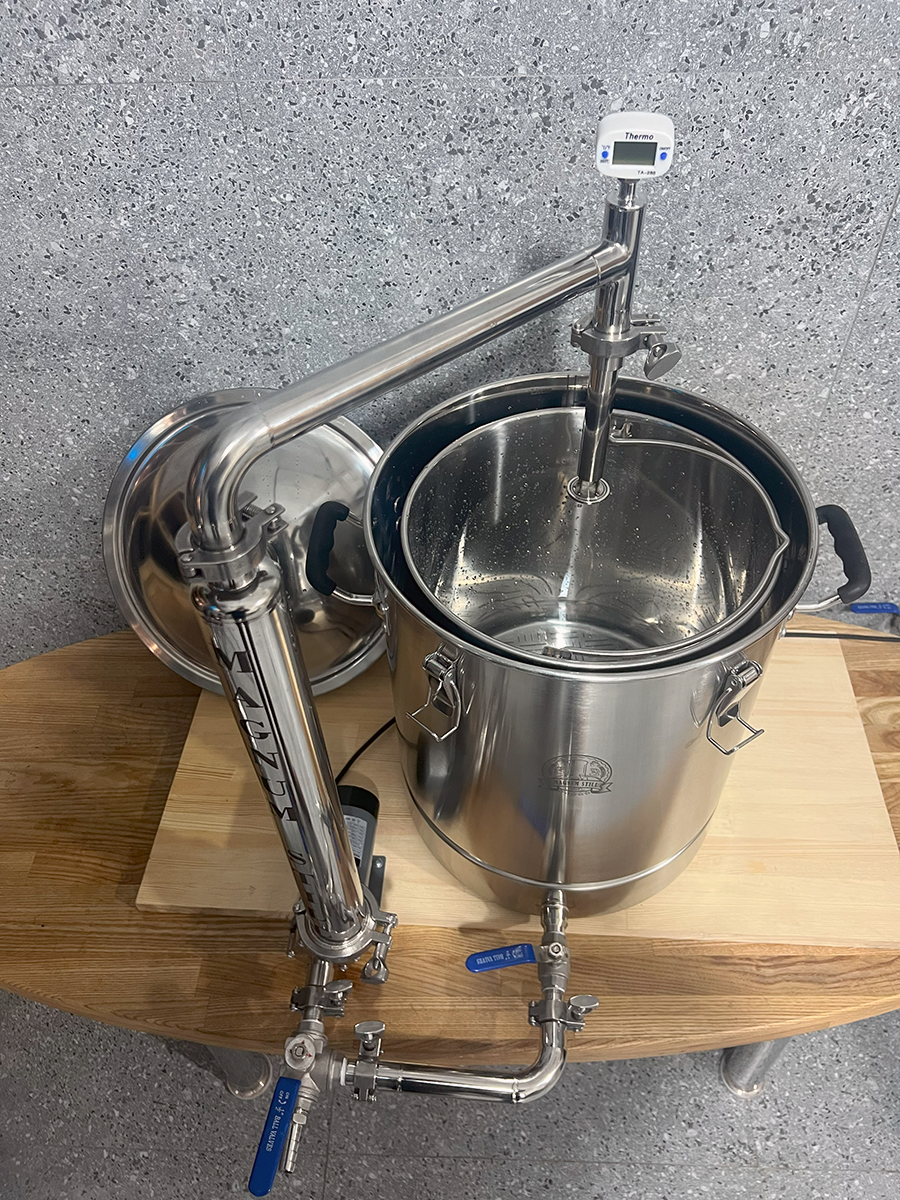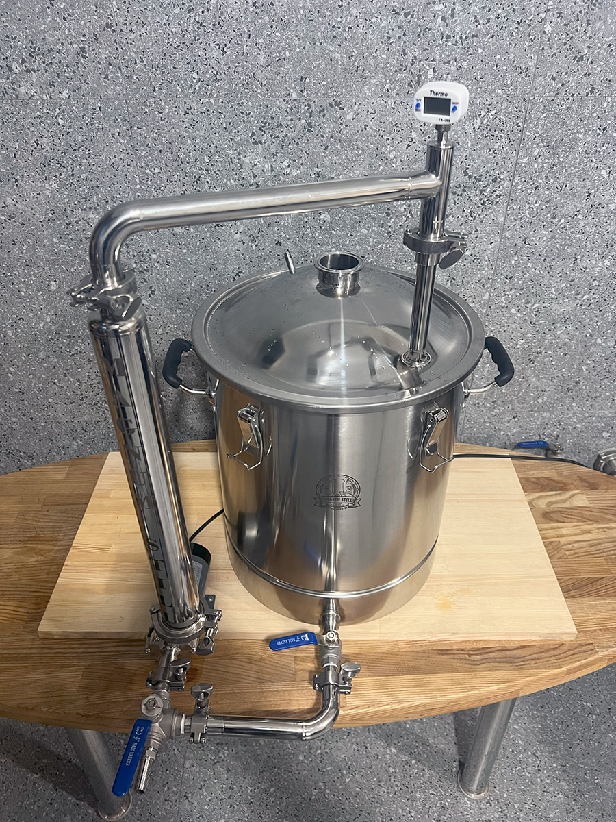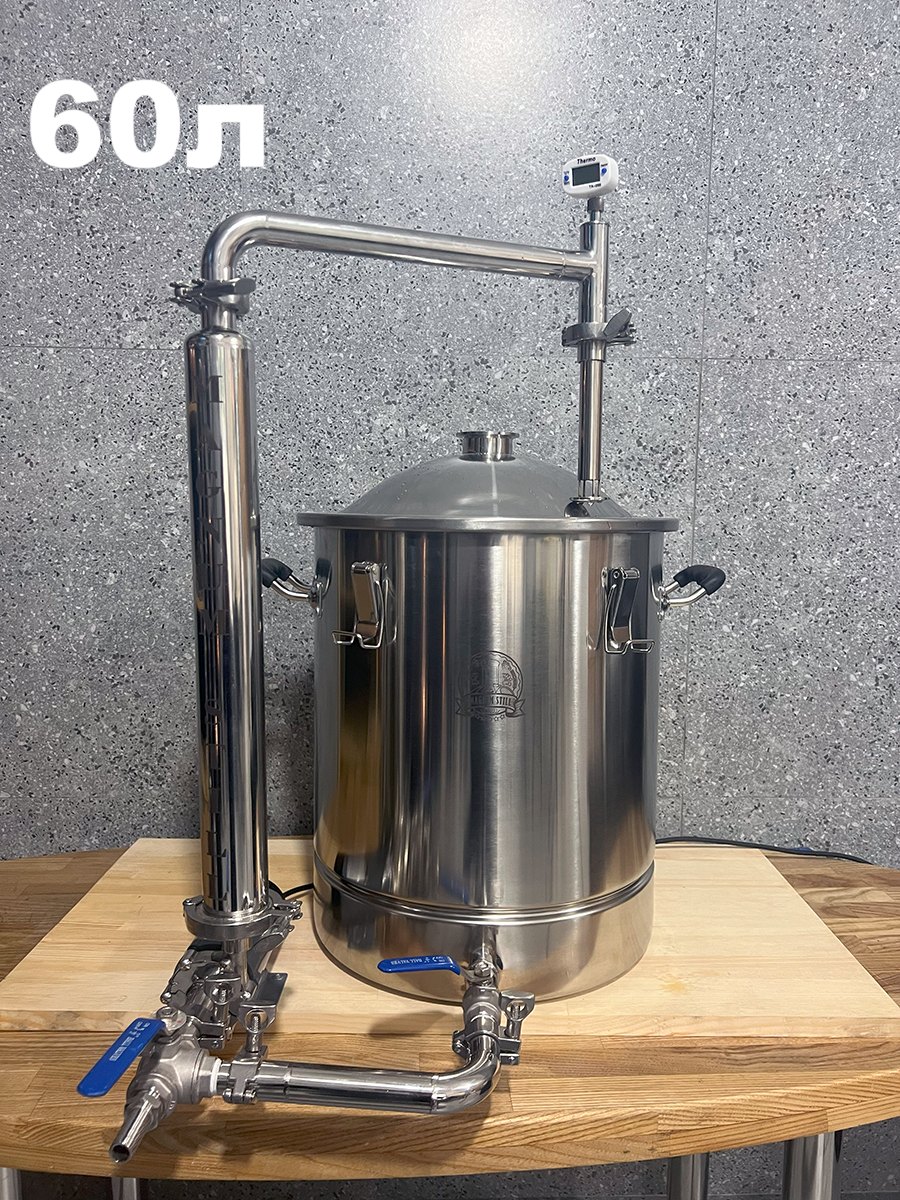 Домашня пивоварняз системою циркуляції та швидкого охолодження суславід компанії MagnumStill Базова комплектація:1) Перегінний куб 60л з клампом під тен, купольною кришкою та ніпелем під термометр - 1 шт.2) Зливний кран 1/2" нержавійка - 1 шт.3) Електронний термометр - 1 шт.4) Сито-бункер - 1шт.5) Навісне обладнання та комплектцючі:DN16 Фланець кламповий з зовн. різьбою 1/2" - 3 шт.DN16 Хомут кламповий з прокладкою - 3 шт.DN16 Нижня Г-подібна трубка на кламповому з'єднанні - 1 шт.Штуцер шланговий зовн. різьба 1/2" - "ялинка" (зовн. діамером 15мм) - 1 шт.Перехідник з різьби 1/2" (внутрішня) на кламп 2" - 1 шт.Кран трьохходовий 1/2"DN16 Фланець кламповий з внутр. різьбою 1/2" - 1 шт.Насос MP-15 RM2" Хомут кламповий з прокладкою - 1 шт.Чілер - 1 шт.DN25 Хомут з прокладкою - 2шт.DN25 Верхня трубка на кламповому з'єднанні (з ніпелем) 1 шт.Електронний термометр - 1 шт.DN25 фланець кламповий приварний - 1 шт.DN25 регульована трубка орошення - 1 шт.Фільтр "базука" 15см - 1 шт.Шланг поліуретановий - 4 м.Швидкозйоми - 2 шт.Фум-стрічка Додатково можна придбати:1) Електричний нагрівач (ТЕН)2) Регулятор потужності3) Утеплювач4) Дистиляційну колону Основні переваги:1. Харчова нержавіюча сталь марки AISI3042. Потужний протиточний охолоджувач (чилер) з нержавіючої гофротрубки3. Потужний високотемпературний насос (MP-15 RM) з магнітною муфтою4. Готова циркуляційна система5. Рухомий верхній трубопровід6. Регульована трубка орошення7. Трьохходовий кран з можливістю зливу залишків сусла8. Розбірна конструкція на кламповому з'єданні Схема підключення води в теплообмінник (чілер)