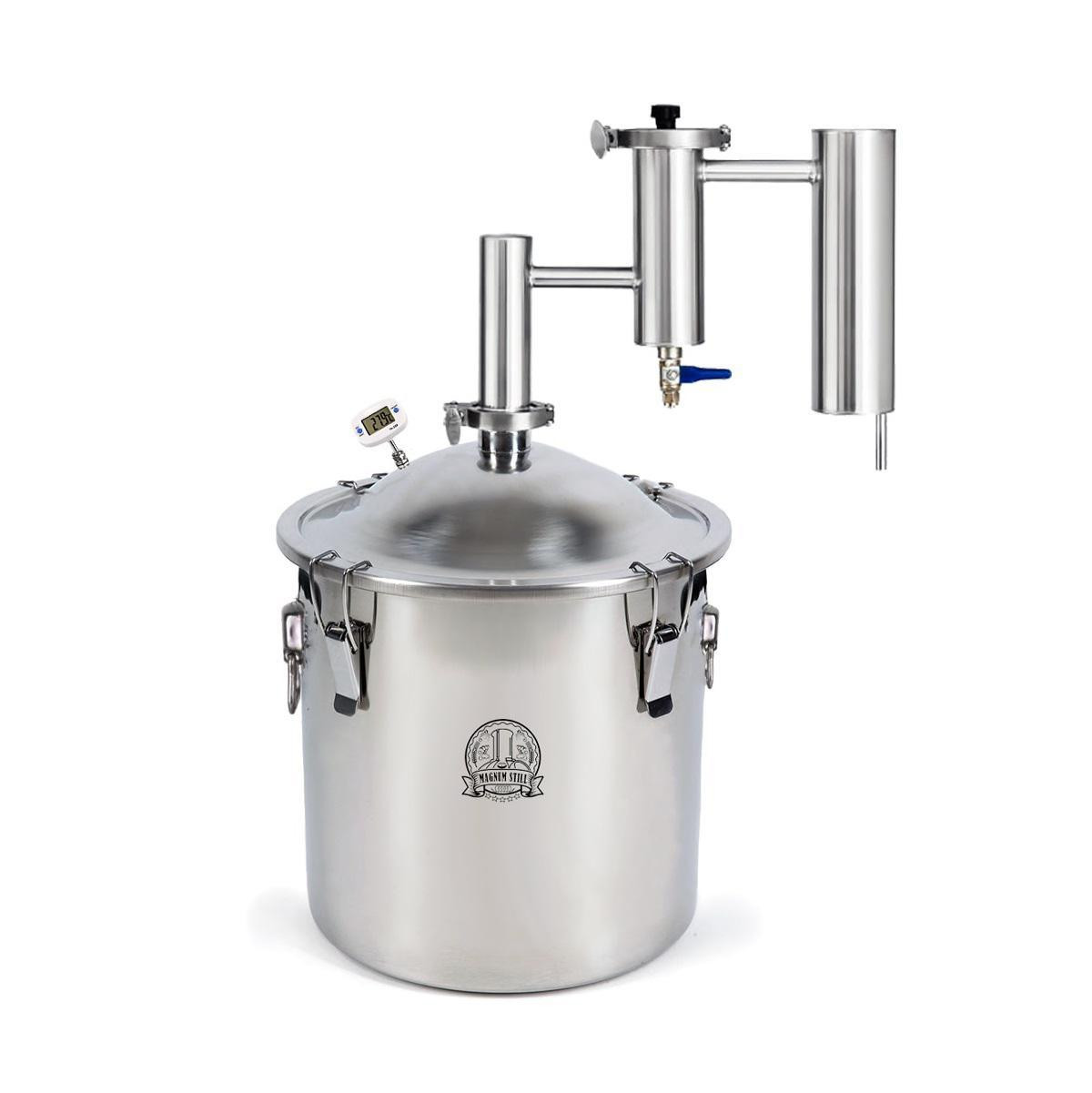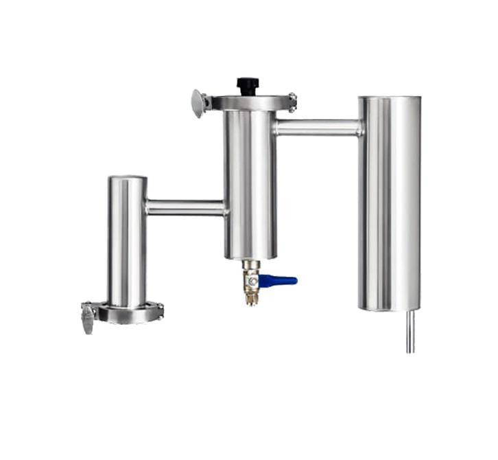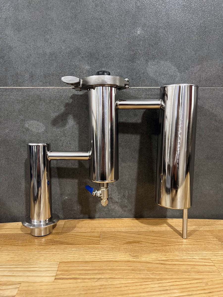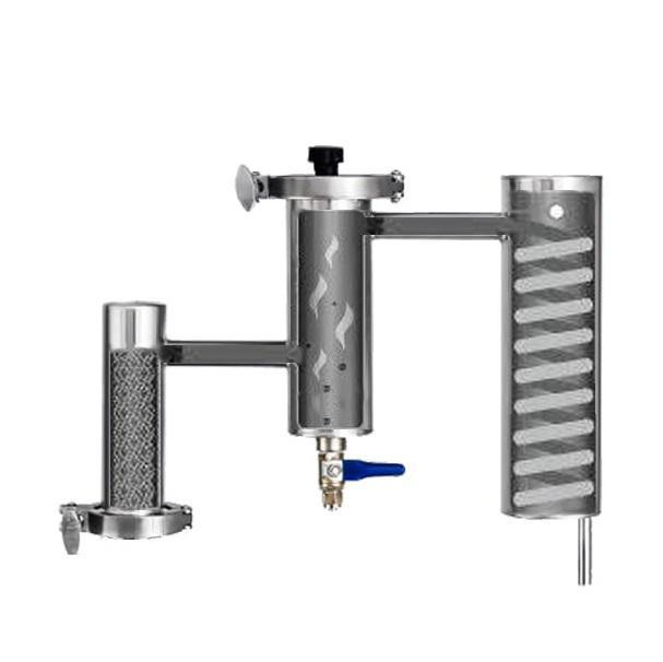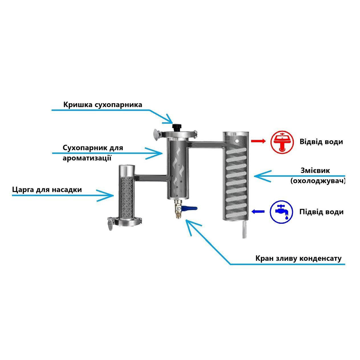 Дистилятор із сухопарником "Хмель-Мастер" (без куба) Додатково можна придбати:- перегінний куб- бункер для ароматизації, що встановлюється в сухопарник- мідну насадку Панченкова для додаткового очищення- дефлегматор та царгу з насадкою для отримання продукту найвищої якості Сухопарник – це додатковий конструктивний елемент дистиляційного апарату, що очищає спиртові пари від важких фракцій та домішок.Головне призначення – підвищення якості очищення дистиляту. Відбувається це за рахунок фізичного, а не хімічного очищення. У сухопарнику за рахунок невеликої різниці температур у порівнянні з перегінним кубом осідають сивушні олії, смоли, метанолові фракції. Цей пристрій виконує кілька додаткових функцій:- запобігає попаданню браги у готовий продукт, створюючи своєрідний буфер між перегінним кубом та охолоджувачем- може бути додатковим приладом для напою ароматизації. У сухопарник додають спеції, фрукти, трави та орехи для того, щоб пари спирту, що проходять, насичувалися приємними запахами природних ароматизаторів. Як влаштований сухопарник?Він являє собою циліндр із двома трубками. Одна веде з перегінного куба, яким надходить пара. Друга трубка йде до змієвика (охолоджувача). Пари, що вже очистилися від важких фракцій та домішок (за рахунок різниці температур у кубі та сухопарнику), просуваються до конденсатора (охолоджувача). У дні сухопарника є зливне отвір для звільнення від осади. Ефективність роботи пристрою залежить від температури нагрівання сировини. При мінімальній температурі сивушних олій буде осідати більше, а чистота очищення буде ефективнішою.Рекомендована потужність нагрівача перегінного куба від 1,5 кВт до 2 кВт. У такому режимі сухопарник працює найефективніше. Для максимального очищення дистиляту від шкідливих домішок рекомендовано робити перегін у два етапи:1. Перегін браги та отримання сирцю2. Перегін сирцю та отримання дистиляту, що придатний до вживання. На іншому етапі відбір "голів" та "хвостів" є обов'язковим. Комплектація:1) Дистилятор із сухопарником - 1шт.2) Хомут з прокладкою (2") - 2шт.3) Заглушка (кришка) сухопарника (2") - 1шт.4) Латунний кран зливу конденсату із сухопарника (1/4") - 1шт.5) Поліуретановий шланг для підключення води (4м) – 1шт.6) Силіконовий шланг для відбору продукту (1м) – 1шт.7) Фум-стрічка - 1шт.8) Інструкція та гарантійний талон Характеристики:Висота без куба 260ммДіаметр/висота царги 38мм/130ммДіаметр/висота сухопарника 51мм/150ммДіаметр/висота холодильника 60мм/190мм