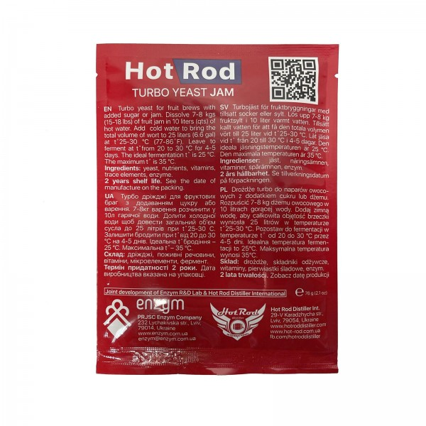 Перші професійні українські Турбо дріжджі Hot Rod Jam на 25 л для фруктових браг з додаванням цукру або варення.Спільна розробка компанії Hot Rod Distiller та R&D лабораторії компанії ПрАТ "Компанія Ензим" (український виробник дріжджів із столітньою історією).Швидше за найпопулярніші імпортовані дріжджі.Мають чудовий органолептичний профіль.Чудово освітлюються після бродіння.Не утворюють піну під час перегонки. Зроблені в УкраїніСпосіб застосування: Брага з варення (приклад)7-8 кг варення розчинити у 10л гарячої води. Долити холодної води щоб довести загальний об'єм сусла до 25 літрів при t˚ 25-30 С. Всипати дріжджі з пакету та залишити бродити при t˚від 20 до 30 °С на 4-5 днів. Ідеальна t˚ бродіння – 25 °С. Максимальна t˚– 35 °С. Фруктова брага з цукром (приклад)Змішайте 10-12 кг подрібнених фруктів + 2-3 кг цурку залежно від вмісту цукру у фруктах + 10-12 літрів води (так щоб довести загальний обʼєм браги до 25 літрів.Всипати дріжджі з пакету та залишити бродити при t˚від 20 до 30 °С на 4-5 днів. Ідеальна t˚ бродіння – 25 °С. Максимальна t˚– 35 °С. Склад: дріжджі, поживні речовини, вітаміни, мікроелементи, фермент.Термін придатності: 2 роки. Дата виробництва вказана на упаковці.Вага: 69 г