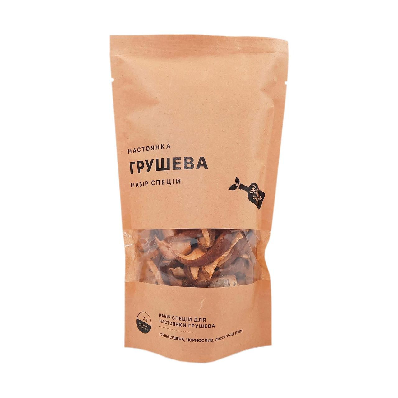 Поєднання ароматних та солодких плодів груші, сушеного літнього листя і запашних сухофруктів – це смак, що нагадує бабусині компоти з дитинства. ПРИГОТУВАННЯ НАСТОЯНКИ ГРУШЕВА На все вам знадобиться:- 3 л алкоголю міцністю 40% - Цей набір спецій - 50 г сахара - 50 мл воды Приготування:Інгредієнти з упаковки залити алкоголем. Перемішати і прибрати в темне місце на 2 тижні. Періодично струшувати настій. Відфільтрувати. З цукру і води приготувати цукровий сироп і додати в напій. Перемішати і дати настоятись ще 2-3 дні.