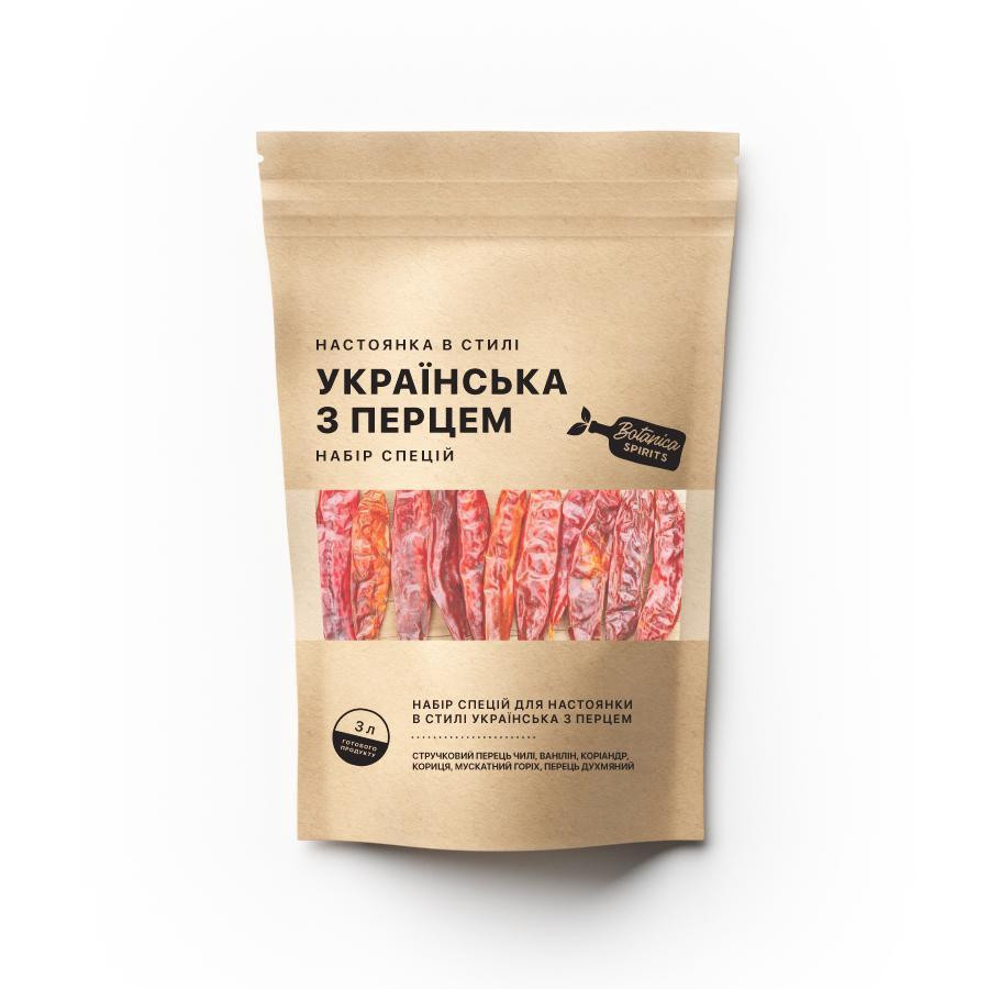 Цілком традиційний і водночас новий продукт. У багатообразній палітрі смакових відчуттів домінують м'які перцеві тони. Легкий солодкуватий напій доповнюється виразними нотками прянощів. Рецепт настоянки Українська з перцем:Інгредієнти з упаковки залити 3 літрами горілки або самогону подвійної перегонки міцністю 40-45%. Перемішати і прибрати в темне, прохолодне місце на 3-4 тижні. Періодично струшувати настій. Відфільтрувати, внести за бажанням 30-50 грам цукру (меду) і дати відпочити 5-7 днів.