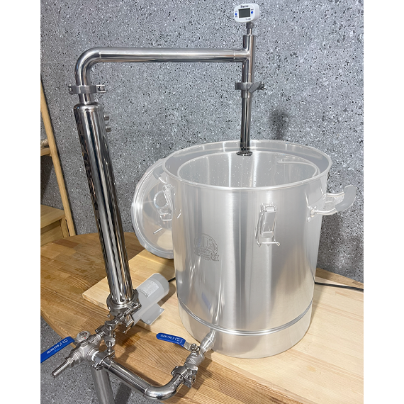 Обладнання та комплектуючі для побудови домашньої пивоварніна базі фірмового перегінного кубавід компанії MagnumStill Базова комплектація (без насоса):1) DN16 Фланець кламповий з зовн. різьбою 1/2" - 3 шт.2) DN16 Хомут кламповий з прокладкою - 3 шт.3) DN16 Нижня Г-подібна трубка на кламповому з'єднанні - 1 шт.4) Штуцер шланговий зовн. різьба 1/2" - "ялинка" (зовн. діамером 15мм) - 1 шт.5) Перехідник з різьби 1/2" (внутрішня) на кламп 2" - 1 шт.6) Кран трьохходовий 1/2"7) DN16 Фланець кламповий з внутр. різьбою 1/2" - 1 шт.8) 2" Хомут кламповий з прокладкою - 1 шт.9) Чілер - 1 шт.10) DN25 Хомут з прокладкою - 2шт.11) DN25 Верхня трубка на кламповому з'єднанні (з ніпелем) 1 шт.12) Електронний термометр - 1 шт.13) DN25 фланець кламповий приварний - 1 шт.14) DN25 регульована трубка орошення - 1 шт.15) Фільтр "базука" 15см - 1 шт.16) Шланг поліуретановий - 4 м.17) Швидкозйоми - 2 шт.18) Фум-стрічка Основні переваги:1. Харчова нержавіюча сталь марки AISI3042. Потужний протиточний охолоджувач (чилер) з нержавіючої гофротрубки3. Готова циркуляційна система4. Рухомий верхній трубопровід5. Регульована трубка орошення6. Трьохходовий кран з можливістю зливу залишків сусла7. Розбірна конструкція на кламповому з'єданні Схема підключення води в теплообмінник (чілер)