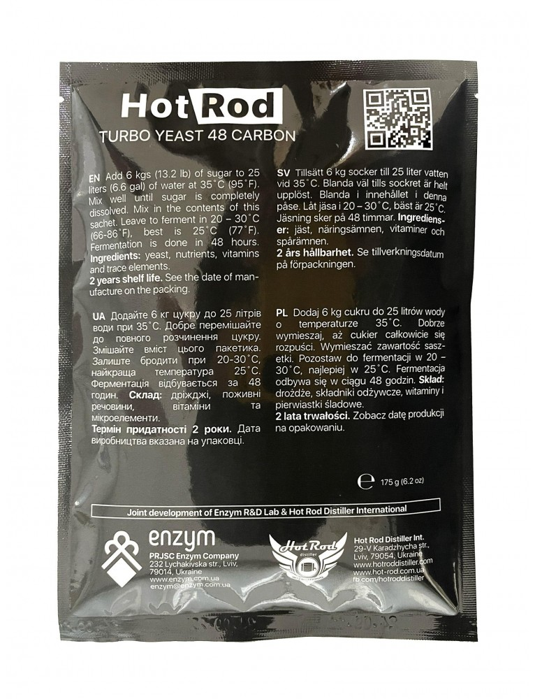Перші професійні українські Турбо дріжджі з вугіллям Hot Rod 48 Carbon для цукрових браг:Спільна розробка компанії Hot Rod Distiller та R&D лабораторії компанії ПрАТ "Компанія Ензим" (український виробник дріжджів із столітньою історією).Швидше за найпопулярніші імпортовані дріжджі.Мають чудовий органолептичний профіль.Брага сама освітлюється на 3 добу.Можна поєднувати до 4 пачок у затори на 100 літрів.Не утворюють піну під час перегонки.Зроблені в Україні.Вугілля працює протягом усього бродіння, а після закінчення процесу, вугілля додатково усуне запах та осадить мертві дріжджові клітини.Спосіб використання: Додайте 5 - 7 кг цукру до 25 літрів води при 35˚C. Добре перемішайте до повного розчинення цукру. Дочекайтесь поки температура води досягне 23-25 °С. Змішайте вміст цього пакетика. Залиште бродити при 20-30˚C, найкраща температура 25˚C. 5 або 6 кг цукру - ферментація відбувається за 48 годин. 7 кг цукру - ферментація відбувається за 3-4 доби. Термін придатності:2 рокиСостав:Дріжджі, вітамини, мікроелементи, поживні речовини Вага:175 г